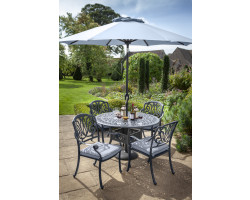 This spacious four seat cast aluminium Hartman Amalfi set is ideal for dining al fresco with family and friends. Designed for comfort the set is elegant as well as practical making it the ideal choice for dining and relaxing. The parasol has an easy to use crank handle and a tilt facility for extra shade. It is secured with a sturdy 15kg base.
