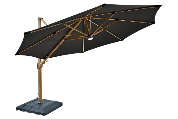 Impress your friends and family with the ultimate in garden accessories. The Seychelles Cantilever can impress day and night, featuring solar powered LED lights to add a touch of glamour to your dinner parties and a Bluetooth speaker to play your favorite music. The Seychelles Cantilever comes with an abundance of features; it's shower resistant, hard wearing canopy is UPF50+ Certified, offering the ultimate protection from the sun. The lower crank handle offers 360 degrees rotation for continuous shade as the sun moves throughout the day. The stunning Folie pole gives you the look of wood, without the annual maintenance to keep a golden hue. This impressive cantilever parasol also comes with a base included.